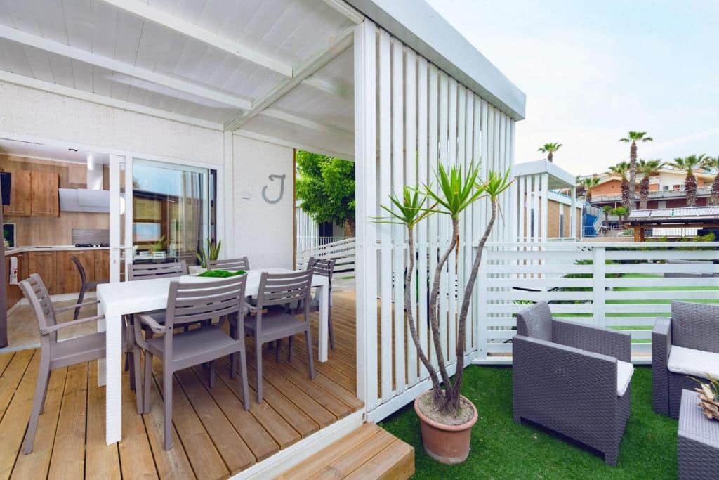 Libertà in Sicurezza: L’emozione di vedere il proprio cane rilassato nella veranda della casa mobile o davanti alla piazzola, godendosi la vita all’aria aperta in un contesto protetto e amichevole.