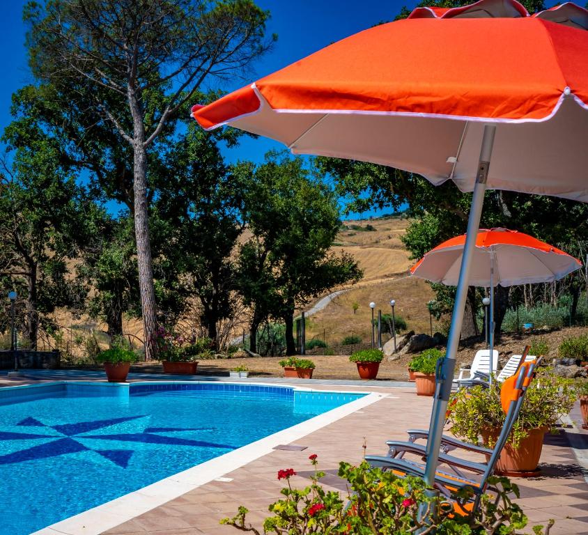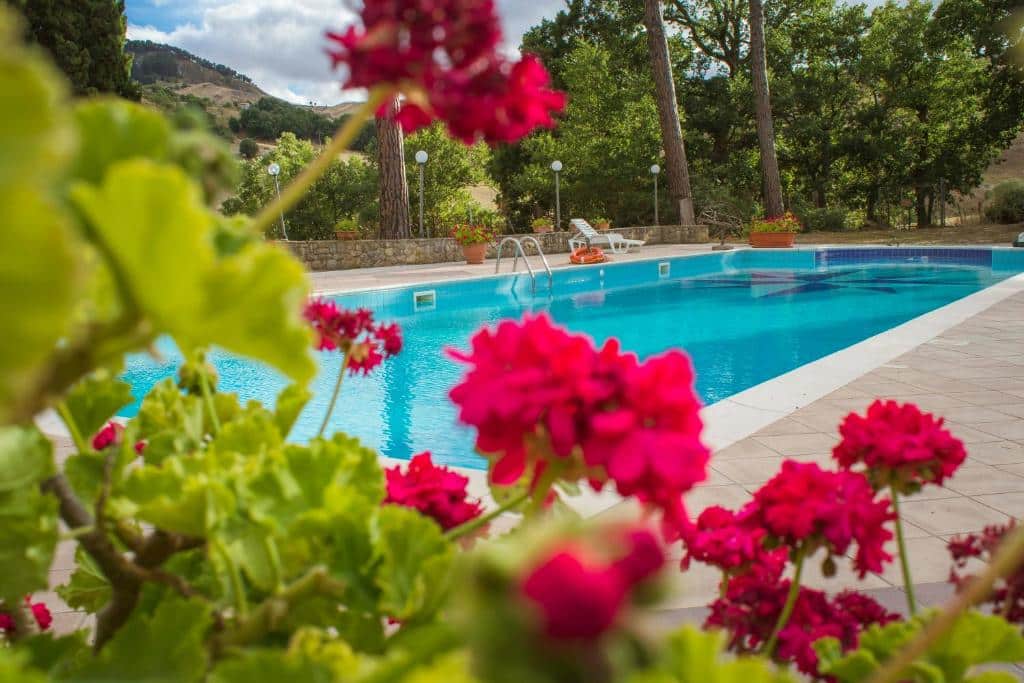 Piscina con Vista Panoramica: Una splendida piscina esterna circondata dal verde, dove nuotare ammirando i profili delle Madonie. L’area solarium è il luogo perfetto per respirare l’aria purissima di Gangi e lasciarsi rigenerare dal sole.