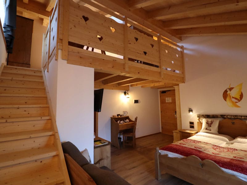 Il Profumo del Legno: L’emozione di dormire in stanze tutte diverse, realizzate in legno locale profumato, dove ogni dettaglio — dalle fate intagliate ai tessuti caldi — contribuisce a creare un nido di protezione contro il freddo della montagna.